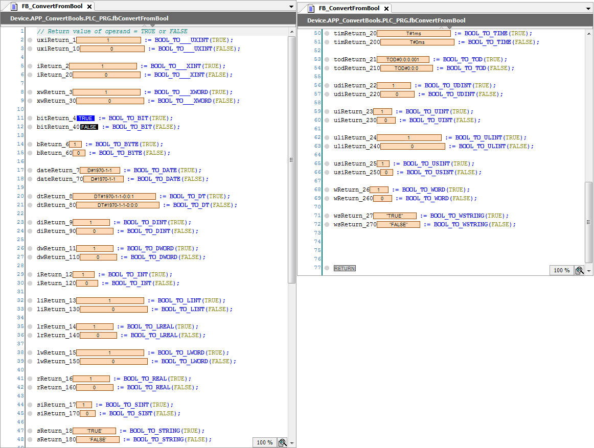 FUNCTION_BLOCK FB_ConvertFromBool VAR VAR uxiReturn_1: __UXINT; uxiReturn_10: __UXINT; iReturn_2: __XINT; iReturn_20: __XINT; xwReturn_3: __XWORD; xwReturn_30: __XWORD; bitReturn_4: BOOL; bitReturn_40: BOOL; bReturn_6: BYTE; bReturn_60: BYTE; dateReturn_7: DATE; dateReturn_70: DATE; dtReturn_8: DATE_AND_TIME; dtReturn_80: DATE_AND_TIME; diReturn_9: DINT; diReturn_90: DINT; dtReturn_10: DATE_AND_TIME; dtReturn_100: DATE_AND_TIME; dwReturn_11: DWORD; dwReturn_110: DWORD; iReturn_12: INT; iReturn_120: INT; liReturn_13: LINT; liReturn_130: LINT; lrReturn_14: LREAL; lrReturn_140: LREAL; lwReturn_15: LWORD; lwReturn_150: LWORD; rReturn_16: REAL; rReturn_160: REAL; siReturn_17: SINT; siReturn_170: SINT; sReturn_18: STRING; sReturn_180: STRING; todReturn_19: TIME_OF_DAY; todReturn_190: TIME_OF_DAY; timReturn_20: TIME; timReturn_200: TIME; todReturn_21: TIME_OF_DAY; todReturn_210: TIME_OF_DAY; udiReturn_22: UDINT; udiReturn_220: UDINT; uiReturn_23: UINT; uiReturn_230: UINT; uliReturn_24: ULINT; uliReturn_240: ULINT; usiReturn_25: USINT; usiReturn_250: USINT; wReturn_26: WORD; wReturn_260: WORD; wsReturn_27: WSTRING; wsReturn_270: WSTRING; END_VAR // Return value of operand = TRUE or FALSE uxiReturn_1 := BOOL_TO___UXINT(TRUE); uxiReturn_10 := BOOL_TO___UXINT(FALSE); iReturn_2 := BOOL_TO___XINT(TRUE); iReturn_20 := BOOL_TO___XINT(FALSE); xwReturn_3 := BOOL_TO___XWORD(TRUE); xwReturn_30 := BOOL_TO___XWORD(FALSE); bitReturn_4 := BOOL_TO_BIT(TRUE); bitReturn_40 := BOOL_TO_BIT(FALSE); bReturn_6 := BOOL_TO_BYTE(TRUE); bReturn_60 := BOOL_TO_BYTE(FALSE); dateReturn_7 := BOOL_TO_DATE(TRUE); dateReturn_70 := BOOL_TO_DATE(FALSE); dtReturn_8 := BOOL_TO_DT(TRUE); dtReturn_80 := BOOL_TO_DT(FALSE); diReturn_9 := BOOL_TO_DINT(TRUE); diReturn_90 := BOOL_TO_DINT(FALSE); dwReturn_11 := BOOL_TO_DWORD(TRUE); dwReturn_110 := BOOL_TO_DWORD(FALSE); iReturn_12 := BOOL_TO_INT(TRUE); iReturn_120 := BOOL_TO_INT(FALSE); liReturn_13 := BOOL_TO_LINT(TRUE); liReturn_130 := BOOL_TO_LINT(FALSE); lrReturn_14 := BOOL_TO_LREAL(TRUE); lrReturn_140 := BOOL_TO_LREAL(FALSE); lwReturn_15 := BOOL_TO_LWORD(TRUE); lwReturn_150 := BOOL_TO_LWORD(FALSE); rReturn_16 := BOOL_TO_REAL(TRUE); rReturn_160 := BOOL_TO_REAL(FALSE); siReturn_17 := BOOL_TO_SINT(TRUE); siReturn_170 := BOOL_TO_SINT(FALSE); sReturn_18 := BOOL_TO_STRING(TRUE); sReturn_180 := BOOL_TO_STRING(FALSE); timReturn_20 := BOOL_TO_TIME(TRUE); timReturn_200 := BOOL_TO_TIME(FALSE); todReturn_21 := BOOL_TO_TOD(TRUE); todReturn_210 := BOOL_TO_TOD(FALSE); udiReturn_22 := BOOL_TO_UDINT(TRUE); udiReturn_220 := BOOL_TO_UDINT(FALSE); uiReturn_23 := BOOL_TO_UINT(TRUE); uiReturn_230 := BOOL_TO_UINT(FALSE); uliReturn_24 := BOOL_TO_ULINT(TRUE); uliReturn_240 := BOOL_TO_ULINT(FALSE); usiReturn_25 := BOOL_TO_USINT(TRUE); usiReturn_250 := BOOL_TO_USINT(FALSE); wReturn_26 := BOOL_TO_WORD(TRUE); wReturn_260 := BOOL_TO_WORD(FALSE); wsReturn_27 := BOOL_TO_WSTRING(TRUE); wsReturn_270 := BOOL_TO_WSTRING(FALSE);