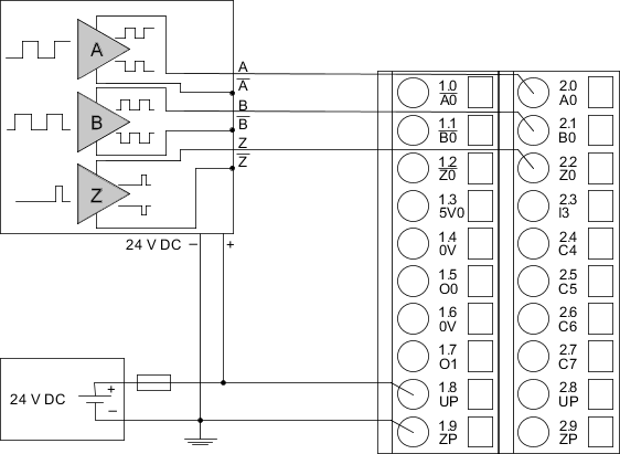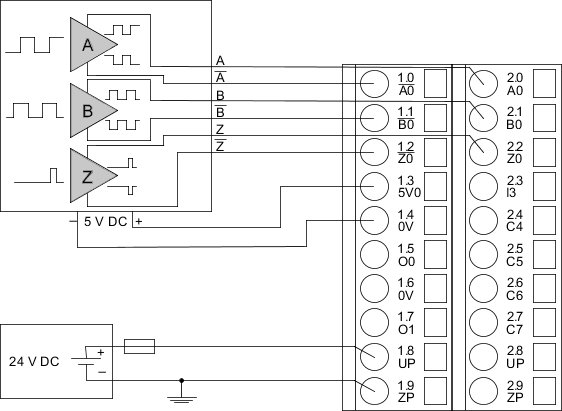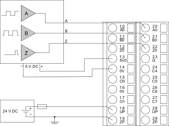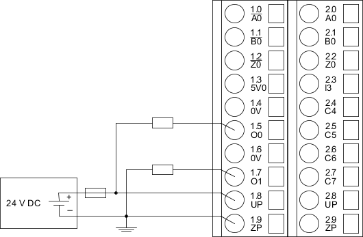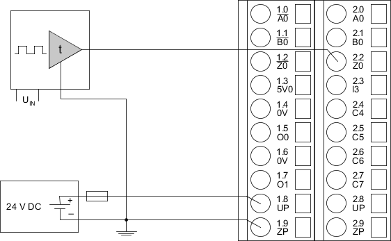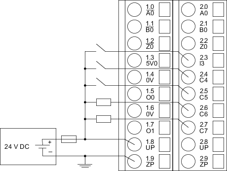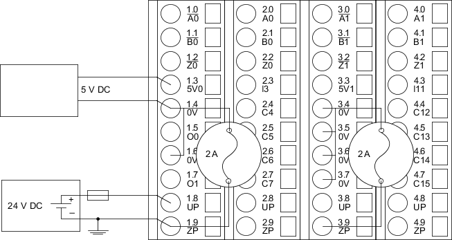 The external power supply connection is carried out via the UP (+24 V DC) and the ZP (0 V DC) terminals.