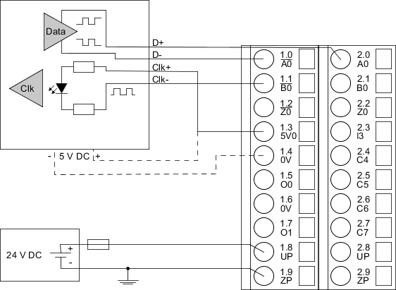 Connection of absolute encoders with an SSI interface and an optocoupler interface at CLK input