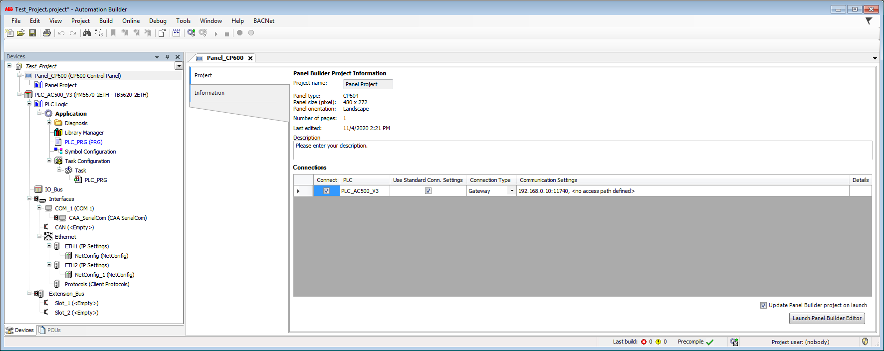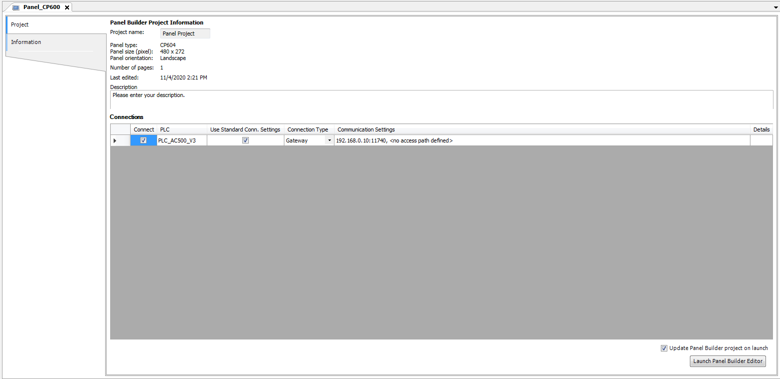 The project information view provides an overview of the Panel Builder project without opening the project. To open the project information, double-click the “Panel_CP600” object.