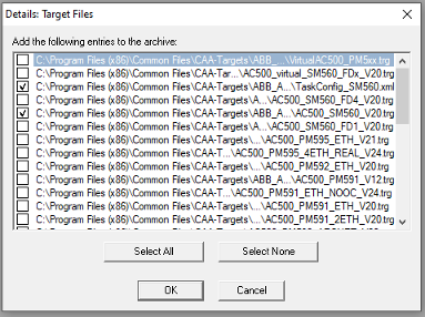 The dialog shows a list of all files which are available for the category: Automatically all files are selected, an exception is category 'Target Files' where only the files are selected which are relevant for the currently set target system. For modifying the selection activate resp. deactivate the desired files. With the button 'Select All' all files of the list are selected, with 'Select None' none of them. A single file can be selected/deselected by a mouseclick in the checkbox, also by a doubleclick on the list entry or by pressing the spacebar when the list entry is marked.