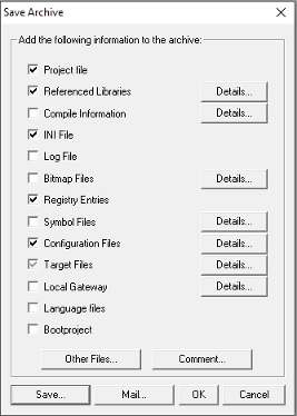 This command is used to set up and create a project archive file. All files which are referenced by and used with a AC500-S Programming Tool project can be packed in a compressed zip file. The zip file can be stored or directly can be sent in an email. This is useful if you want to give forward a set of all project relevant files.