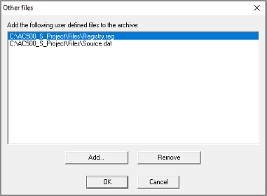 Press [Add] to open the standard dialog for opening a file, where you can browse for a file. Choose one and confirm with [Open]. The file will be added to the list in the 'Other files' dialog. Repeat this for each file you want to add. To delete entries from the list, press [Remove]. When the list of selected files is ok, close the dialog with [OK].