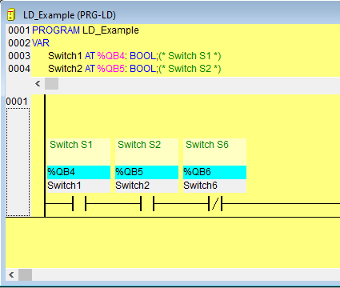 Show Address of Symbol: (only for Ladder editor): If this option is activated and a variable assigned to a contact or coil is assigned to an address, the address will be displayed above the variable name (see example in the figure above).