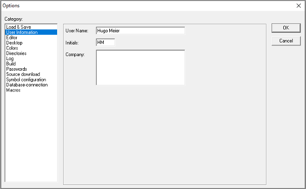 of the user, his initials and the company for which he works. Each of the entries