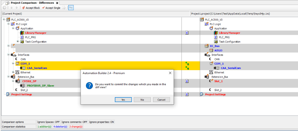 To accept all changes on the current project, close the “Project Comparison - Differences” tab and confirm the prompted dialog.