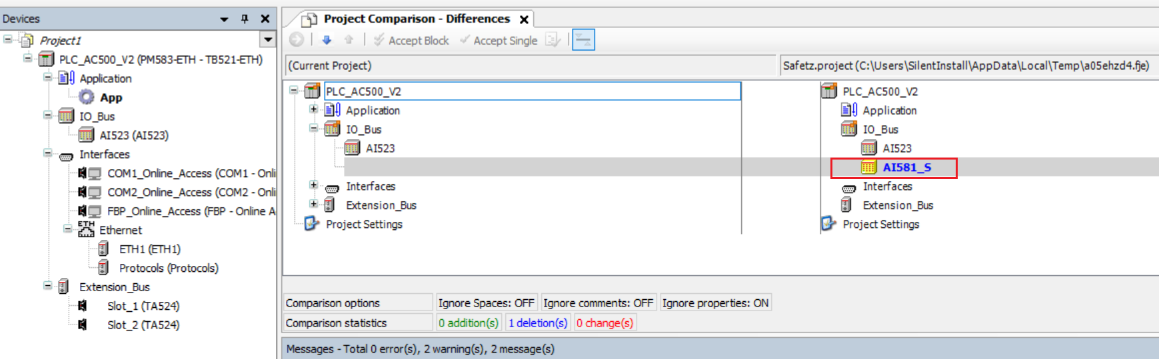 After a successful user authentication the AC500-S safety modules are added to the compare view and can be imported to the current project.