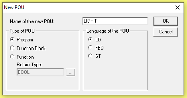 Enter the 'Name of the new POU' in the dialog box which appears. Remember that the name of the object may not have already been used.