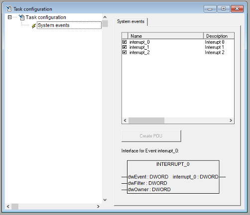 The assignment of system events to POUs is also done in the Task configuration editor. Use the dialog 'Events', which will be opened as soon as the entry " System-events" is selected in the task configuration tree:
